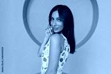 Fabulous pretty girl with dark hair and blue eyes wearing summer bright dress looking at camera over isolated green background