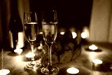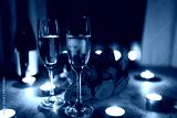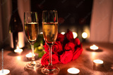 Red roses, candle lights and champagne glasses on table, valentines day background