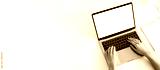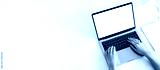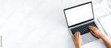 A laptop with a blank white screen, financial charts and a notepad lie nearby. Female hands on the keyboard, browsing the Internet, online correspondence. Copy space, mock-up concept