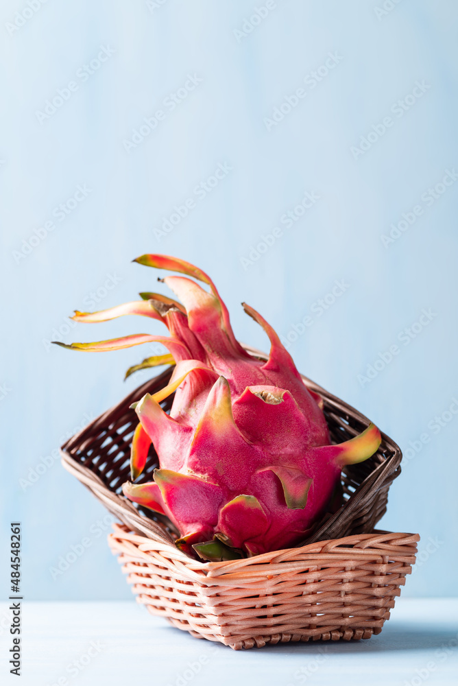Fresh dragon fruit or pitaya in basket on color background, Tropical fruit