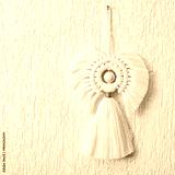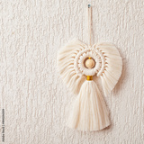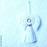 Christmas macrame decor. Christmas angel on white plasterwall background. Natural materials - cotton thread, wood beads. Eco decorations, ornaments, hand made decor. Close up. Copy space