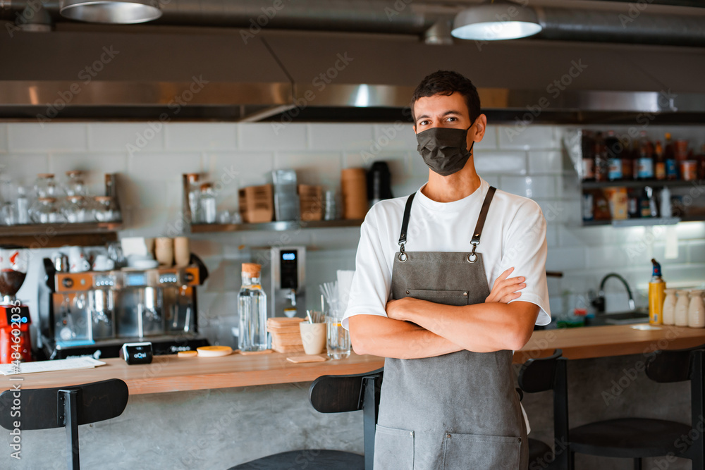 Young man coffee shop owner or barista in face mask and apron working during covid-19 pandemic