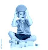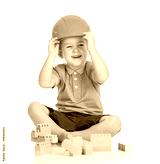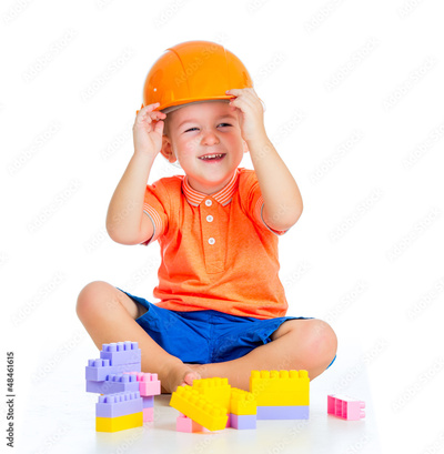 cheerful child boy with hard hat playing with building blocks to