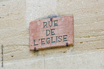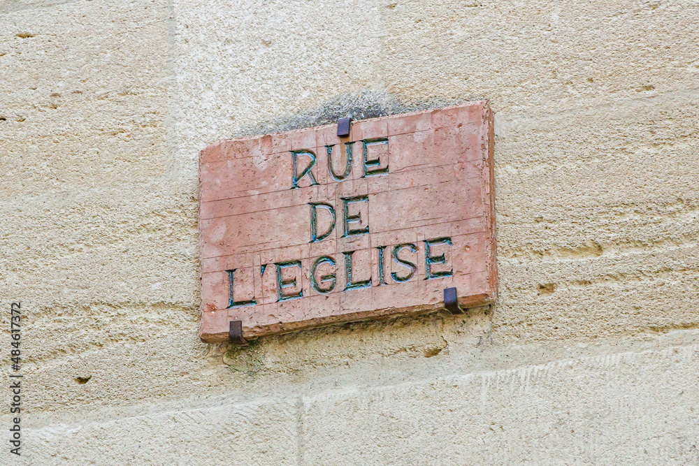 "Rue de l'eglise" street sign in the old medieval village of Gordes, France