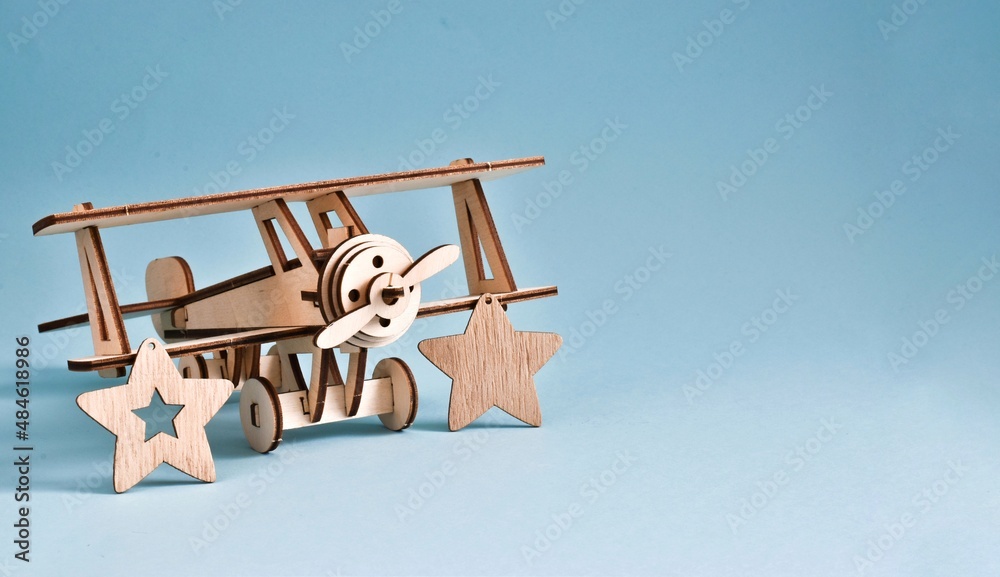 The wooden stars is the symbol of the army. The plane with wood stars on blue background. February 23, 9 may concept. Copy space. Greeting card for holiday