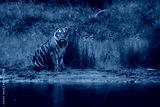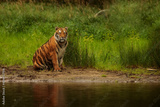 male Siberian tiger (Panthera tigris tigris) sitting near the water with reeds by the shore