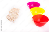 Developing lessons for young children. The development of fine motor skills. Haricot, beans and colored plastic bowl