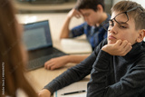 A tired student is bored of listening to classes.Burnt out students have to sit in classes