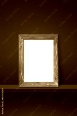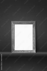 Wooden picture frame leaning on a black shelf. 3d illustration. Vertical background