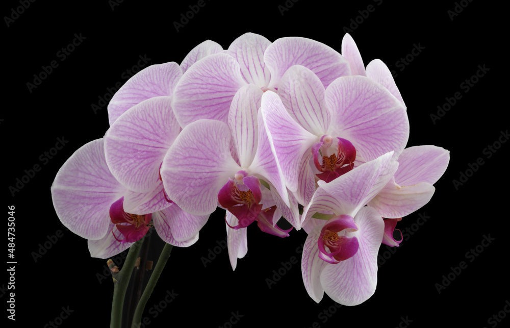 Pink phalaenopsis orchid flower on black. Selective soft focus. Minimalist still life. Light and shadow nature horizontal background.