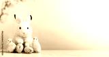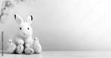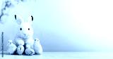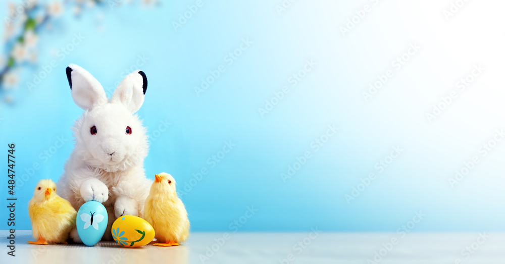 Easter bunny rabbit with painted eggs and chicks on blue background. Easter holiday concept.