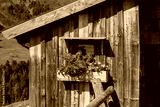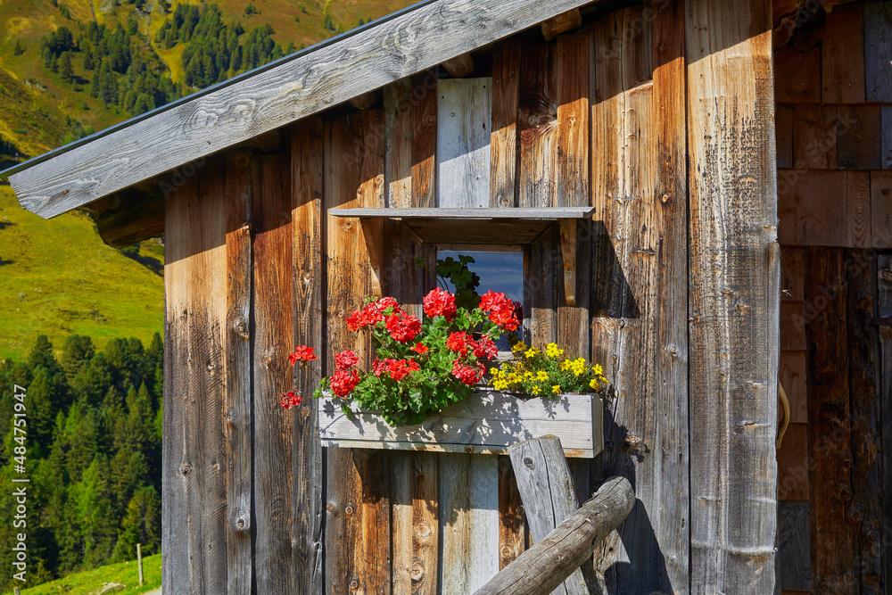 Schöner Fensterschmuck, an einer Berghütte in den österreichischen Alpen.