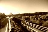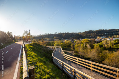 Wooden walkways next to the Dão cycle path that connects the town of Sao Pedro do Sul to Vouzela, Portugal