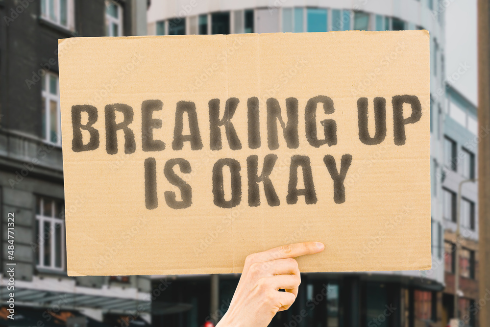 aThe phrase " Breaking up is okay " on a banner in men's hand with blurred sea on the background. Issue. Serious. Upset. Wife. Nervous. Negative. Leaving. Rejection. Relation. Partner. Marriage