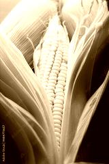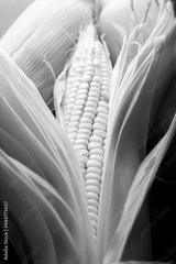 Close up image of raw white corn on the cob on black rustic surface.