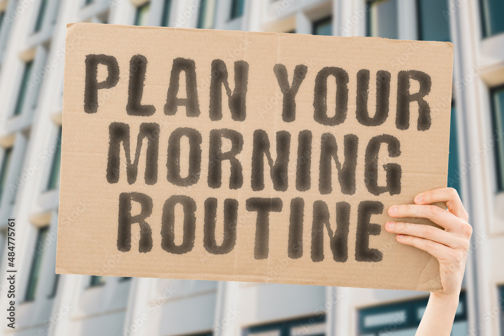 aThe phrase " Plan your morning routine " on a banner in men's hand with blurred background. Everyday. Hurry. Manage. Hours. Create. Date. Daily. Awake. Aspirations. Analyse. Analytics. Agenda