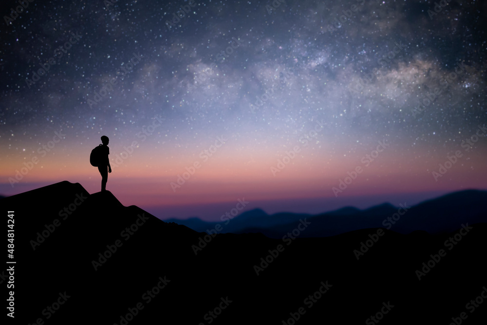 Silhouette of young male traveler with backpack standing and watching the star, milky way over the sky alone on top of the mountain. He enjoyed traveling and was successful when he reached the summit.