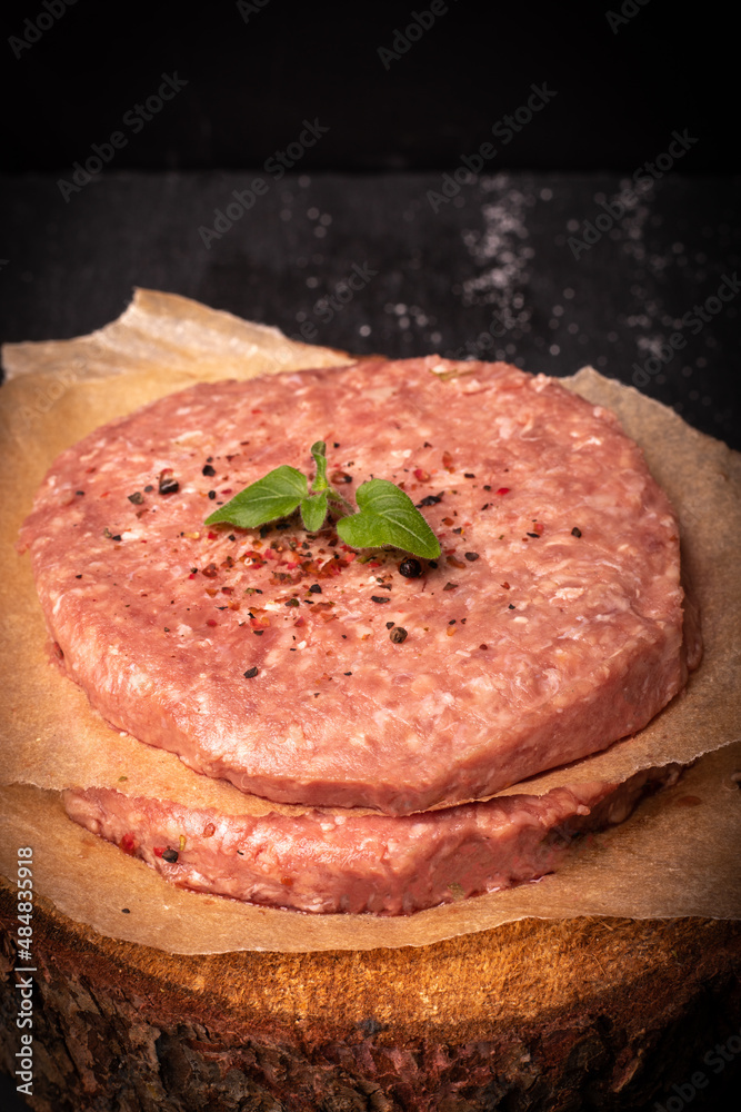 Raw minced meat, meatloaf. Raw meat, French steaks on paper, on wood chopping block, on black background, vertical view.