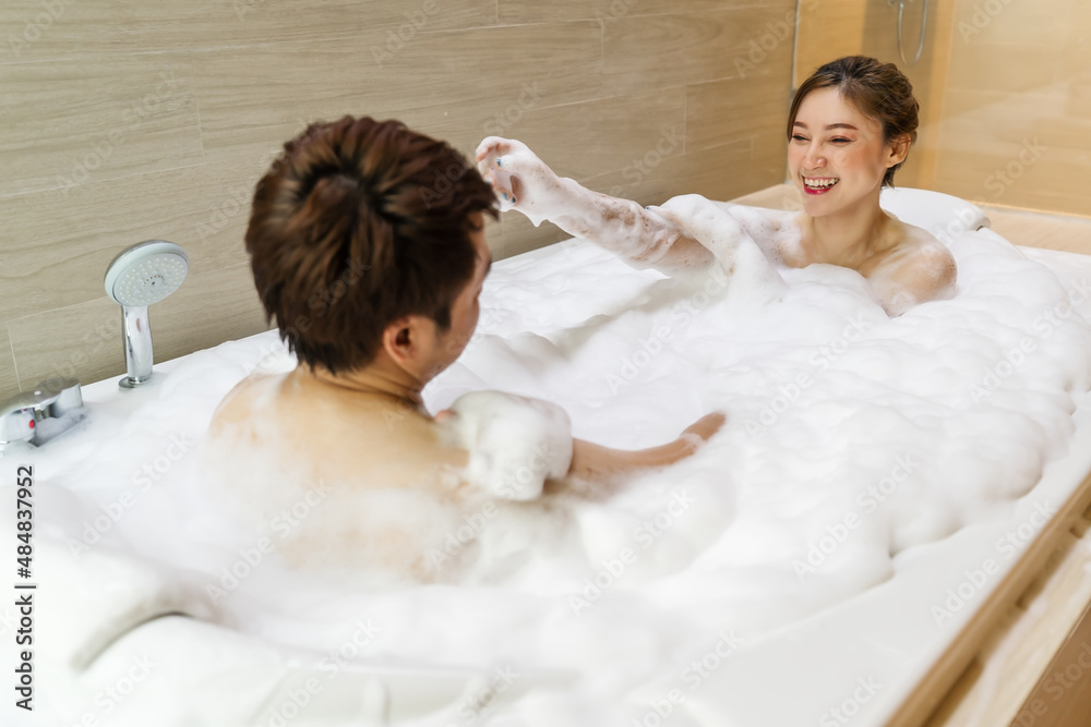 couple washing body with foam in bathtub