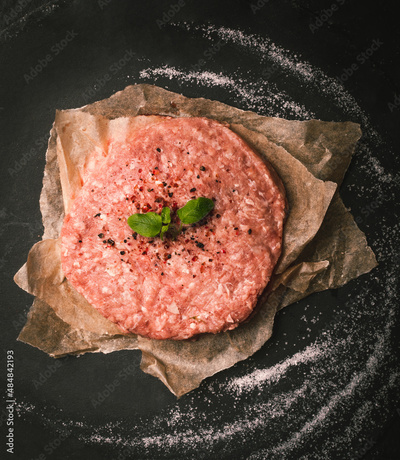 Raw minced meat, meatloaf. Raw meat, French steaks on paper, on blackboard, chalkboard, black background, vertical view.