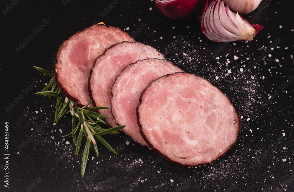 Sliced krakowska sausage, fresh herbs and seasonings on a black background, blackboard, chalkboard. Polish cold cuts.