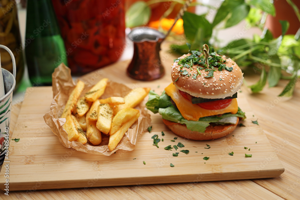 Vege cheeseburger and potato fries on a wooden cutting board. Vegan food set, lunch. Plant-based meal, horizontal view.