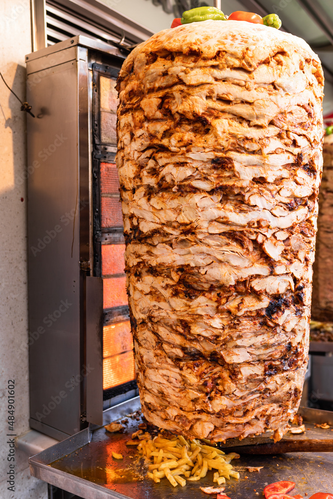 Grilled chicken meat on a vertical rotisserie used in traditional turkish street food Doner Kebab (Shawarma or Gyros in other cultures) in Istanbul, Turkey