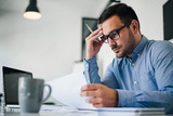 Portrait of stressed out and worried troublesome overworked businessman entrepreneur looking documents report in modern bright office working under pressure and tight deadline