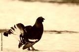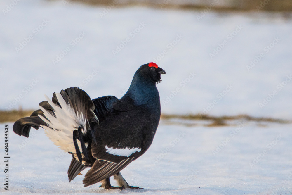Portrait of a lekking Black Grouse, Tetrao tetrix, in snowy landscape in Czech republic