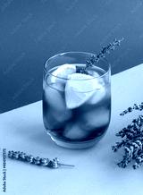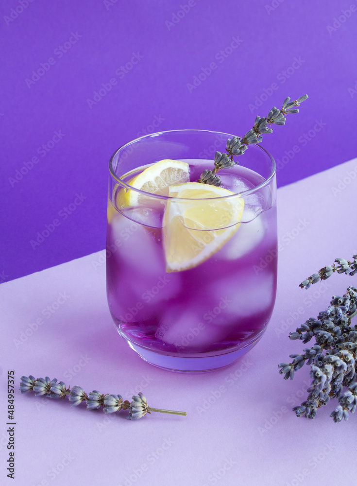 Lavender lemonade with ice and lemon in the drinking glass on the purple background. Location vertical.