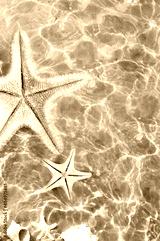 Starfish and seashell on the summer beach in sea water. Summer background.