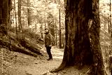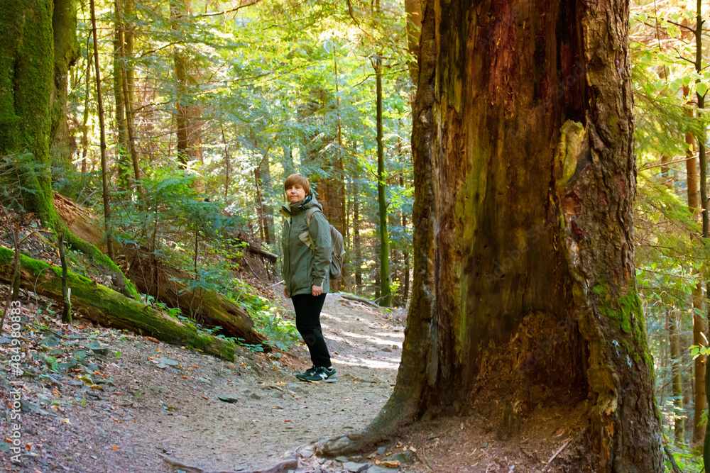 White middle-age woman travels in an ancient forest in Ukrainian Carpathians. Adventure, travel, hiking deep into a green woods. Tall trees covered with green moss. Eco tourism in autumn, spring day.