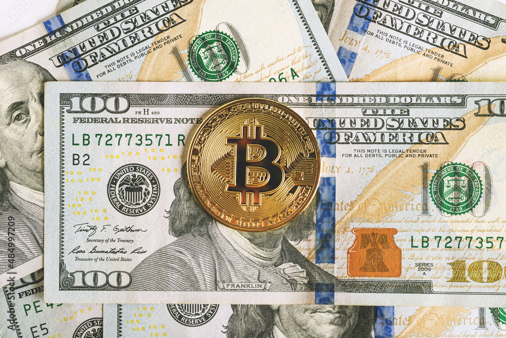 Close-up of bitcoin on benjamin franklin's face on piles of $100 bills
