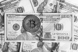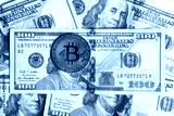 Close-up of bitcoin on benjamin franklin's face on piles of $100 bills