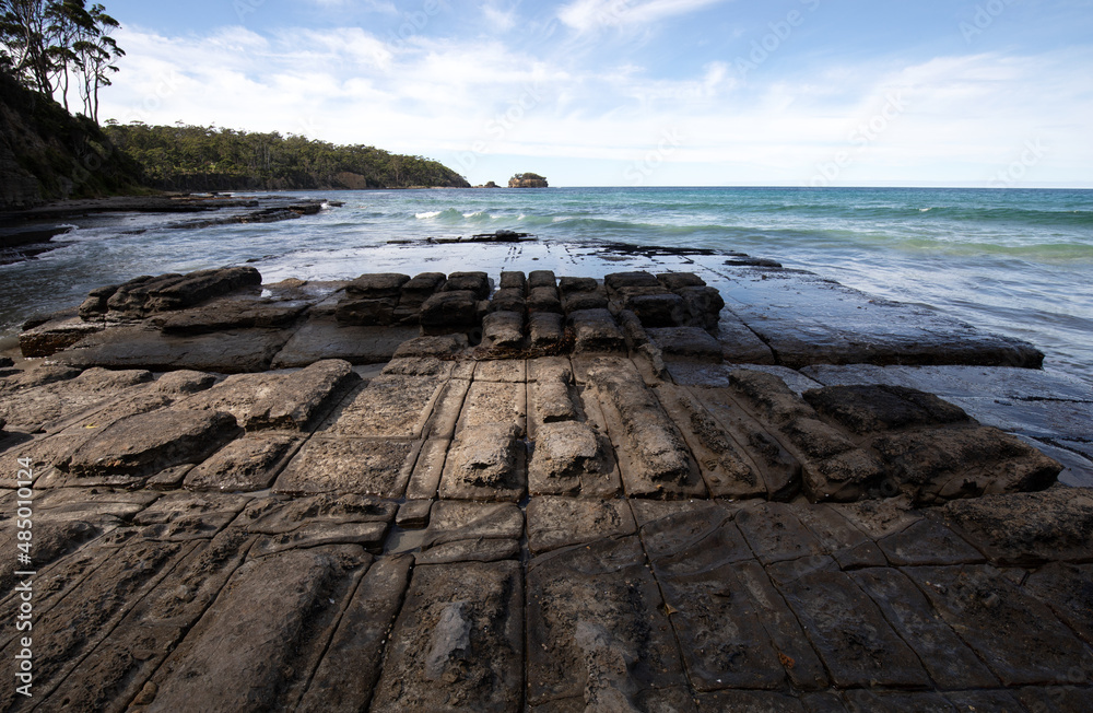 The Tessellated Pavement, located at Lufra, Eaglehawk Neck in Tasmania. It is a well known flat rock surface naturally formed by a series of erosion and concave depression.