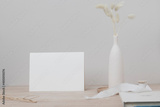 Blank paper card, greeting card mock up. decoration with dried Bunny Tail, Front view, Beautiful Bunny Tail grass in vase on wood table and beige cement wall background