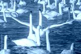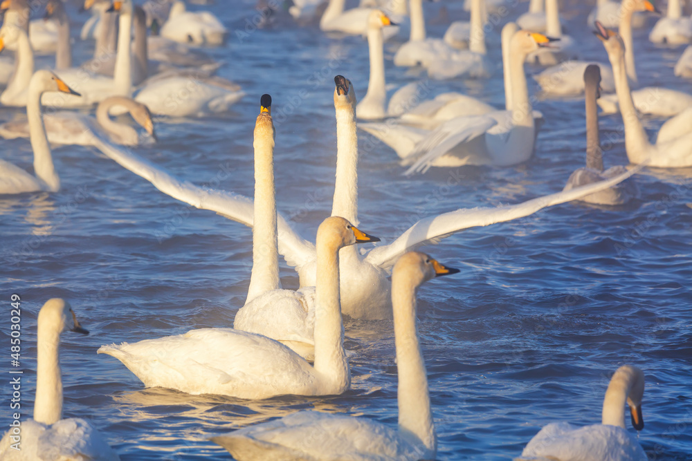 White whooper swans swimming in the nonfreezing winter lake. Altai, Russia