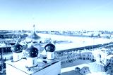 Aerial drone view of Spaso-Preobrazhenskiy transfiguration Cathedral with Volga river in Tver, Russia. Russian winter landscape.