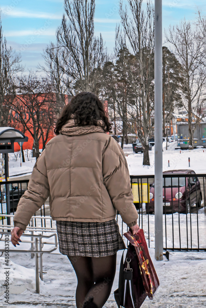 A woman walks down the stairs to the parking lot on a winter day