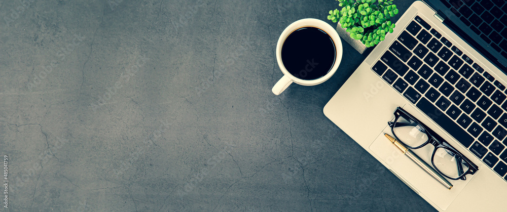 Top view desk or top view table office desk flat lay background with computer laptop and office equipment for work area copy space and education school concepts.