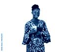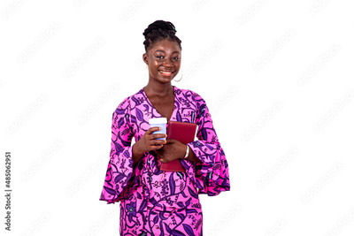 beautiful young businesswoman holding a notebook and a cup of coffee.