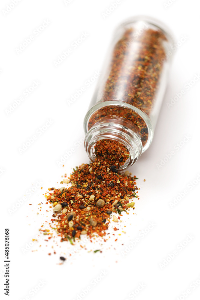 Shichimi Togarashi (aromatic spices that are indispensable for Japanese cuisine)spilled from the bottle.