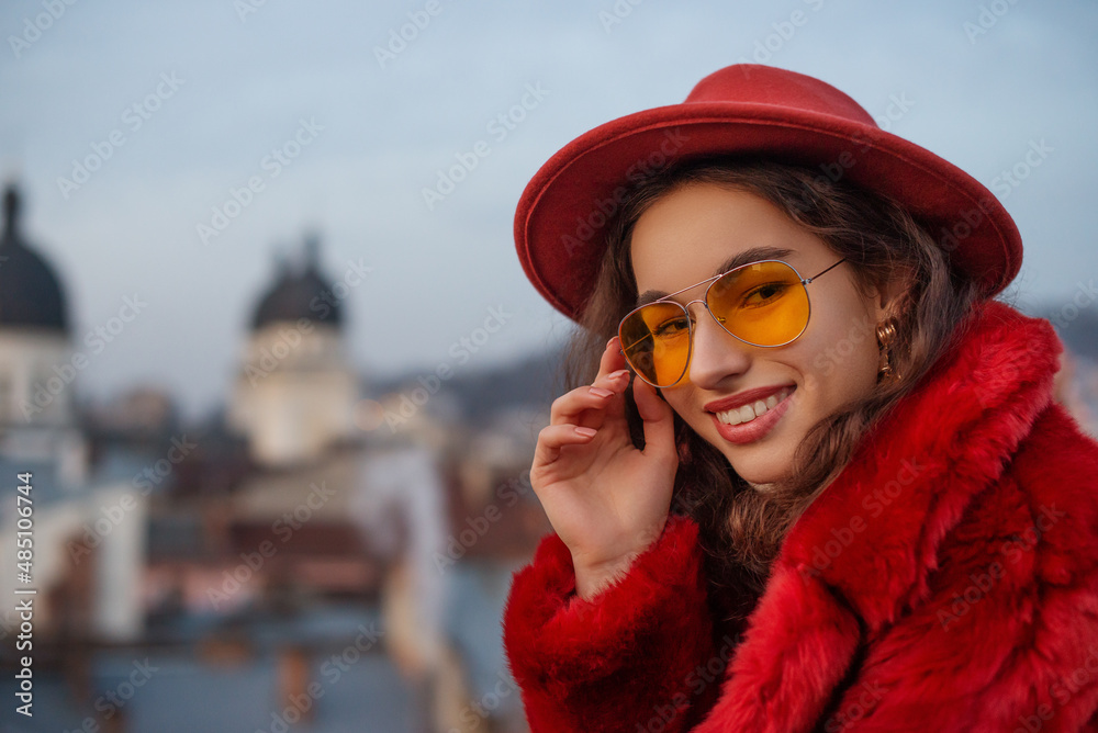 Happy smiling fashionable woman wearing trendy orange glasses, hat, faux fur coat. Beautiful European cityscape on background. Copy, empty space for text