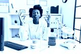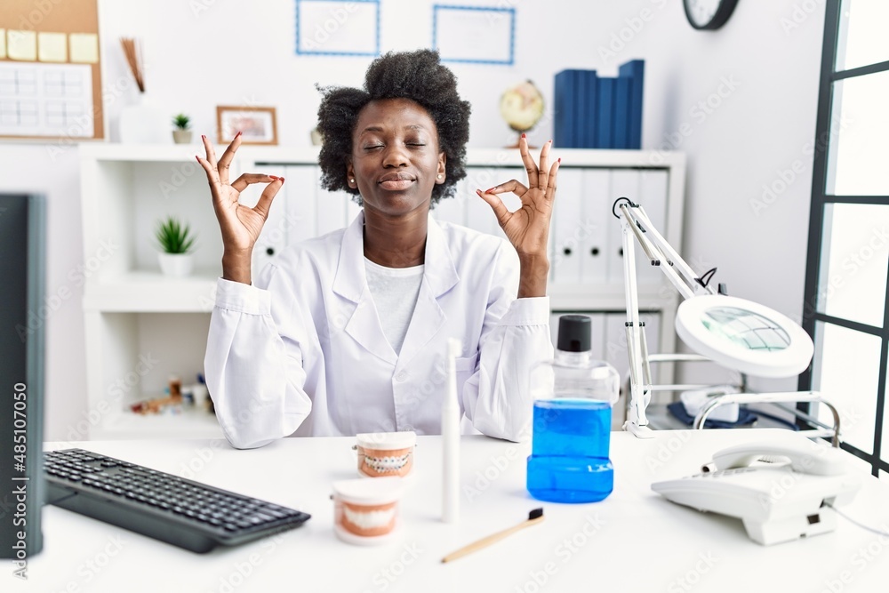 African dentist woman working at medical clinic relax and smiling with eyes closed doing meditation gesture with fingers. yoga concept.