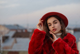 Outdoor fashion portrait of elegant confident woman wearing trendy orange faux fur coat, fedora hat. Copy, empty space for text