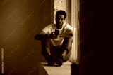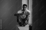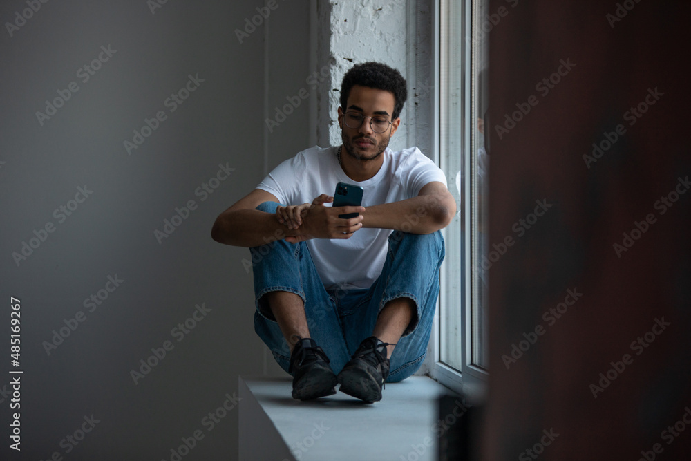 African American man in glasses and a white t-shirt uses a smartphone while sitting by the window.