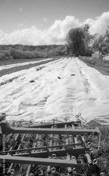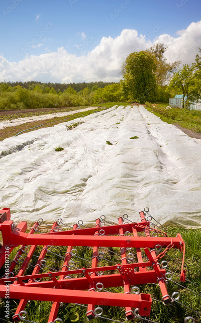 Eco farm with agriculture equipment and nonwoven agrotextile covering field, focus on the foreground.