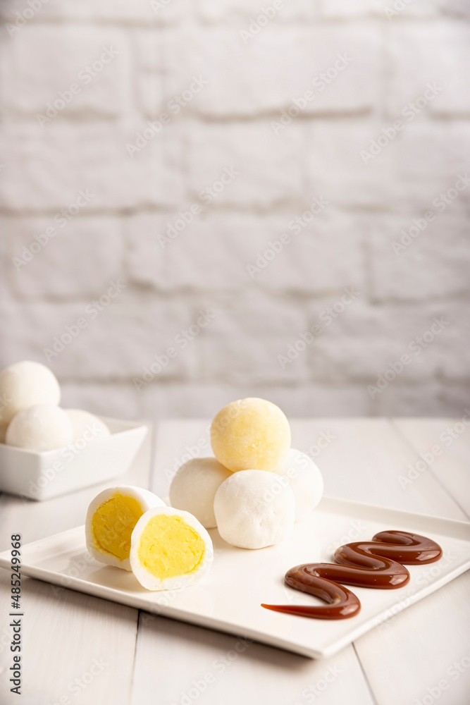 Ice cream Mochis with caramel (cajeta). Traditional Japanese dessert made from rice flour. Close up on white wooden surface with copy space.