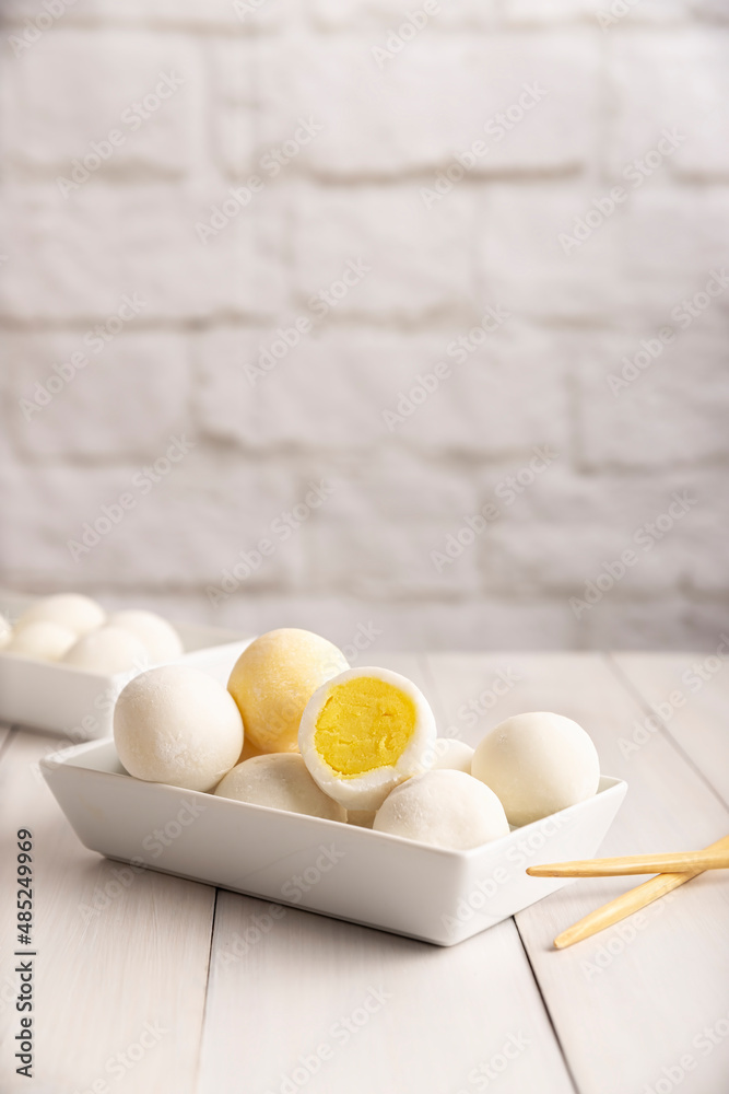 Homemade ice cream Mochis. Traditional Japanese dessert made from rice flour. Close up on white wooden surface with copy space.