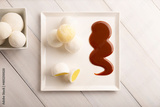Ice cream Mochis with caramel (cajeta). Traditional Japanese dessert made from rice flour. Flat lay on white wooden surface.